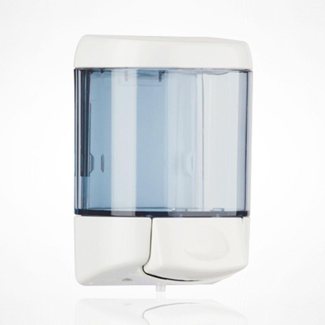 Dispenser di sapone liquido – a riempimento – capacità lt. 0,55 – a PULSANTE, colorie bianco/trasparente.