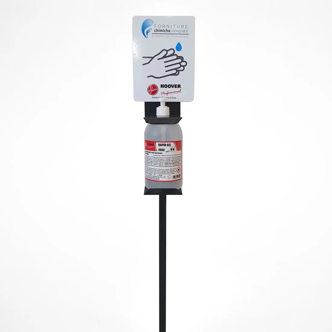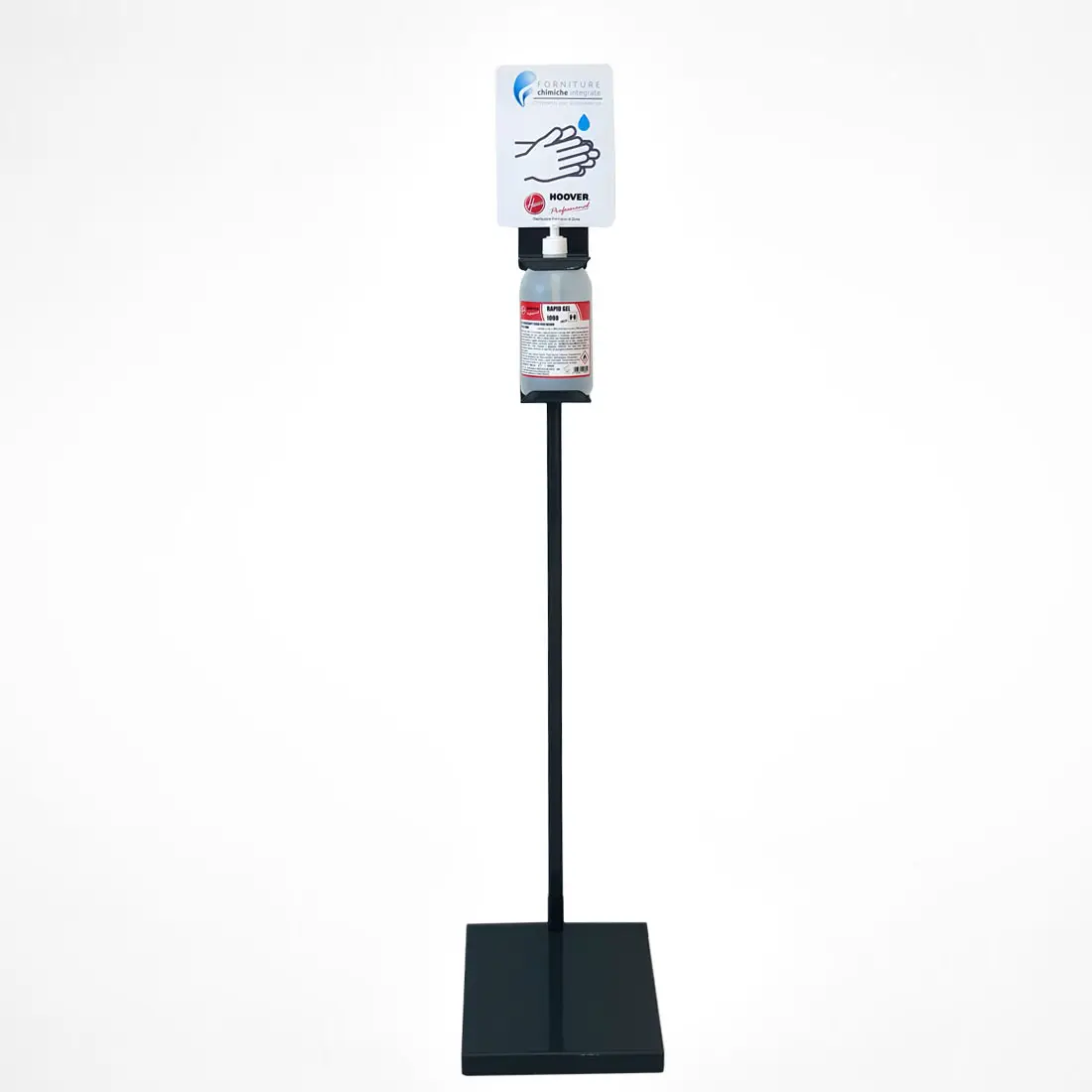 Descrizione :Piantana in acciaio verniciato a polvere, predisposta per alloggiamento flacone RAPID GEL da 1 LT con dispenser manuale (non incluso).